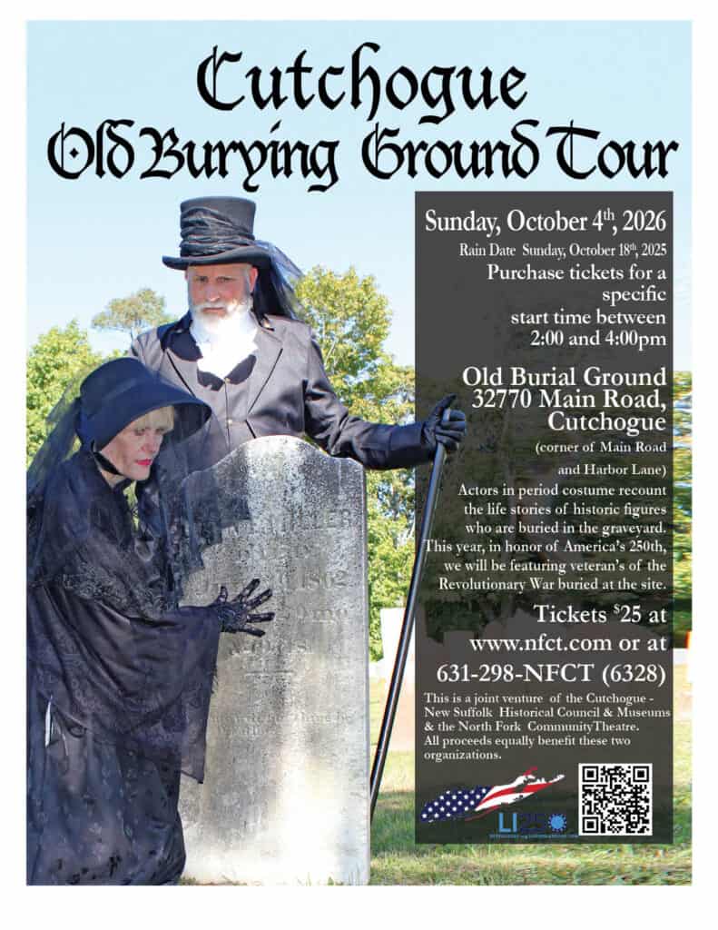 Sunday, October 4, 2026, (rain date Oct. 18th) as a cooperative effort, the Cutchogue-New Suffolk Historical Council and the North Fork Community Theatre will host their fourth annual tour of the Old Cutchogue Burying Ground.