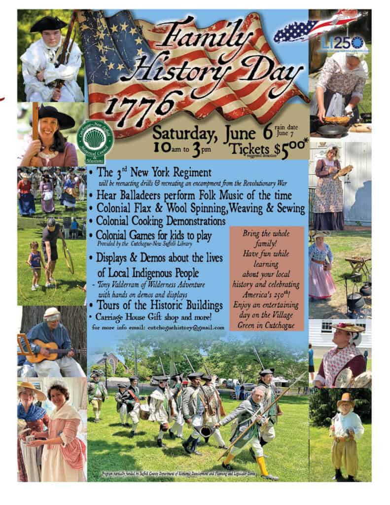 There will also be food and raffles, so bring the whole family and have fun while learning about your local history. We strongly encourage everyone to come in period costume to get into the spirit of the day! (Suggested donation $5.00) For questions, email cutchoguehistory@gmail.com. Get your Suffolk County 250th passbook stamped by The Cutchogue New Suffolk Historical Society & Museums on site.