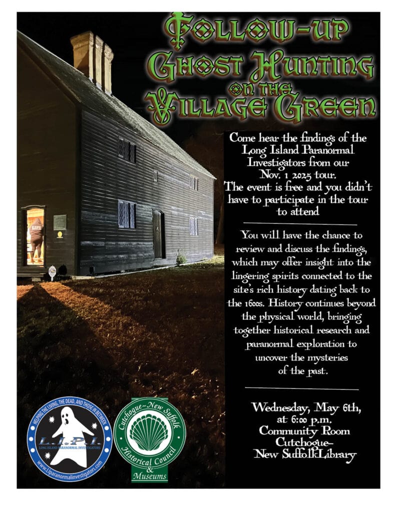 Follow-up to Ghost Hunting on the Village Green. Come hear the findings of the Long Island Paranormal Investigators from our Nov. 1 2025 tour. The event is free and you didn’t have to participate in the tour to attend You will have the chance to review and discuss the findings, which may offer insight into the lingering spirits connected to the site’s rich history dating back to the 1600s. History continues beyond the physical world, bringing together historical research and paranormal exploration to uncover the mysteries of the past. Wednesday, May 6th, at 6:00 p.m., Community Room, Cutchogue-.New Suffolk Library