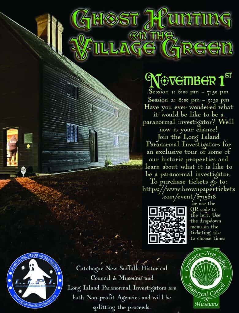 On November 1, the L.I. Paranormal Investigators are coming to the Village Green in Cutchogue for an exclusive tour of the historic buildings of the Cutchogue New Suffolk Historical Council & Museums, including the Wickham house, which often makes the top ten list of most haunted buildings on Long Island. Follow-up from last year’s event shows evidence of haunting in the buildings you will be visiting. You will learn about the history of each building and witness a live paranormal investigation. There are two sessions, with one starting at 6 pm and the second at 8 pm. Report to the Schoolhouse and dress warmly. Tickets are $60.00 and can be purchased at https://www.brownpapertickets.com/event/6715618, where you can choose one of two sessions using the drop-down menu. Tickets are selling fast, so get yours soon!