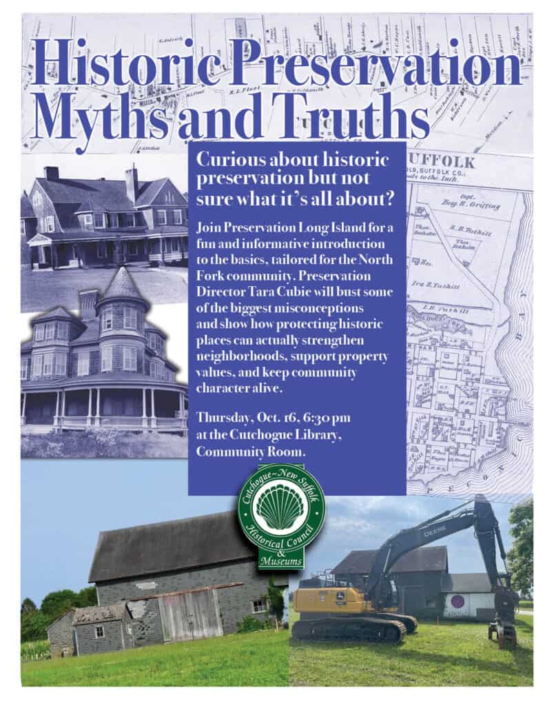 The Cutchogue-New Suffolk Historic Council & Museums presents: Historic Preservation Myths and Truths. Curious about historic preservation but not sure what it’s all about? Join Preservation Long Island for a fun and informative introduction to the basics, tailored for the North Fork community. Preservation Director Tara Cubie will bust some of the biggest misconceptions and show how protecting historic places can actually strengthen neighborhoods, support property values, and keep community character alive. Using real stories from across the North Fork and Long Island, this talk will give you a clear picture of what preservation means—and why it matters—whether you own an older home or simply love the place you live. Thursday, Oct. 16, 6:30 pm at the Cutchogue Library, Community Room.