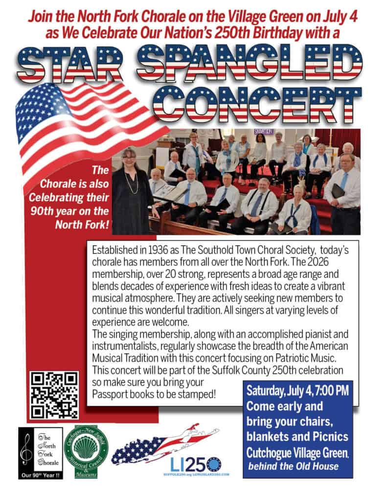 Join the North Fork Choral on the Village Green on July 4 as they celebrate the Nation’s 250th Birthday in a Star Spangled Concert. Established in 1936, originally known as the “Southold Choral Society,” today’s chorale has members from all over the North Fork. The 2026 membership, over 20 strong, represents a broad age range and blends decades of experience with fresh ideas to create a vibrant musical atmosphere. They are actively seeking new members to continue this wonderful tradition. All singers at varying levels of experience are welcome.