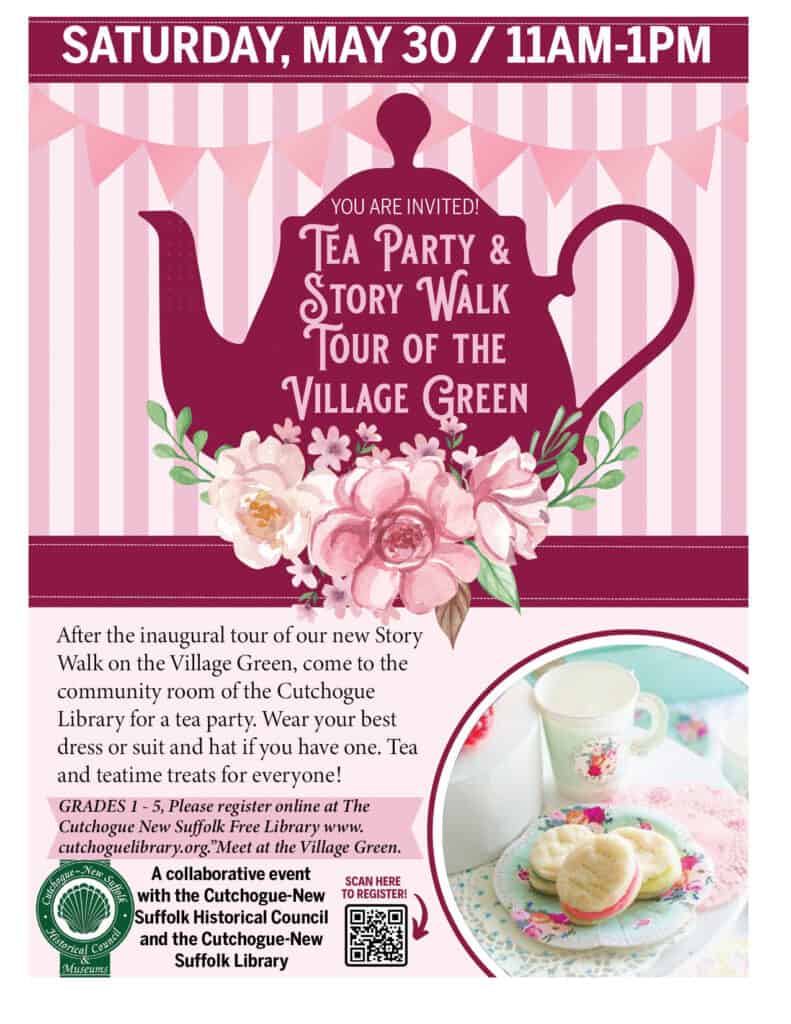 Tea Party & Tour of the Village Green- Join us for the inaugural tour of our Story Walk on the Village Green. Designed for children, these signboards that comprise the walk provide an understandable and fun way for children to experience the local history on and around the Village green. There will be a tea party in the Community Room of the library at the end of the tour. Wear your best dress or suit and hat if you have one. Tea and teatime treats for everyone! GRADES 1 – 5, Please register online at The Cutchogue New Suffolk Free Library www.cutchoguelibrary.org. Meet at the Carriage house on the Village Green. A collaborative event with the Cutchogue-New Suffolk Historical Council and the Cutchogue-New Suffolk Free Library.