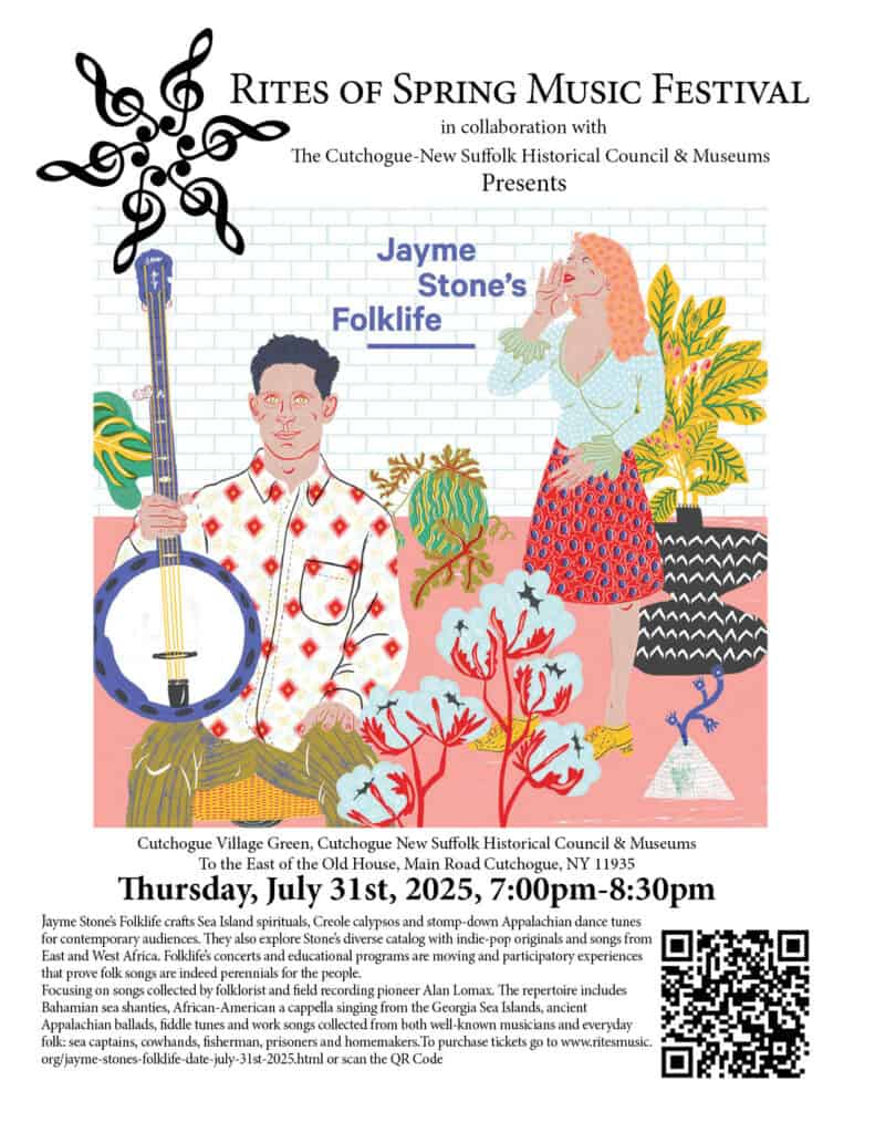 The Rites of Spring Music Festival in collaboration with the Cutchogue New Suffolk Historical Council & Museums presents “Jayme Stone’s Folklife,” featuring the Jayme Stone Thursday, July 31st, 2025, 7:00pm-8:30pm. The band crafts Sea Island spirituals, Creole calypsos and stomp-down Appalachian dance tunes for contemporary audiences. Tickets: $45.00 non-members, $30.00 members. To purchase tickets go to www.ritesmusic.org.